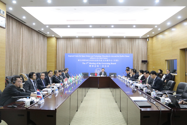 2017年11月29日,联合国附属空间科技教育亚太区域中心(中国)理事会第三次会议在北京航空航天大学召开。会议由区域中心理事会主席、工业和信息化部副部长、国家航天局局长唐登杰主持。联合国外空司空间技术应用项目负责人Luc St-Pierre,阿尔及利亚、阿根廷、玻利维亚、巴西、中国、印度尼西亚、巴基斯坦、秘鲁、委内瑞拉等9个区域中心成员国理事或代表,泰国驻华使馆代表,区域中心咨询委员会主任、北航校长徐惠彬院士,区域中心主任、北航副校长陶智,工业和信息化部、国防科工局相关司局的人员出席了会议。