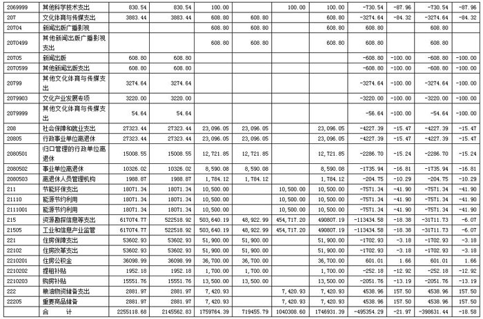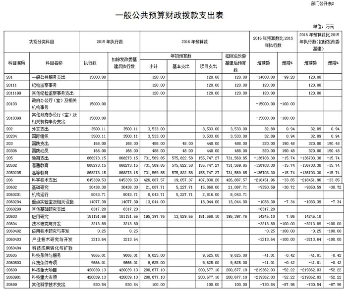 (五)科学技术支出2016年年初预算426,887.57万元,比2015年执行数减少218,451.96万元,减少33.85%。