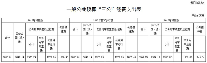 2016年预算数比2015年预算数减少372.06万元。其中:因公出国(境)费较2015年减少77.95万元,公务用车购置及运行费较2015年减少12.22万元,公务接待费较2015年减少281.89万元,主要是执行国务院“约法三章”有关规定,严格控制“三公经费”支出,厉行节约,压缩开支。