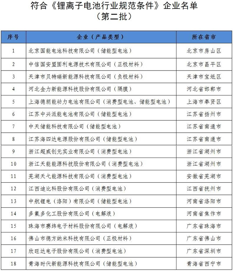 根据《锂离子电池行业规范条件》(工业和信息化部公告2015年第57号)和《锂离子电池行业规范公告管理暂行办法》(工信部电子〔2015〕452号),经企业自愿申报、省级工业和信息化主管部门核实推荐、专家复查、现场核实及网上公示,现将符合《锂离子电池行业规范条件》企业名单(第二批)予以公告。