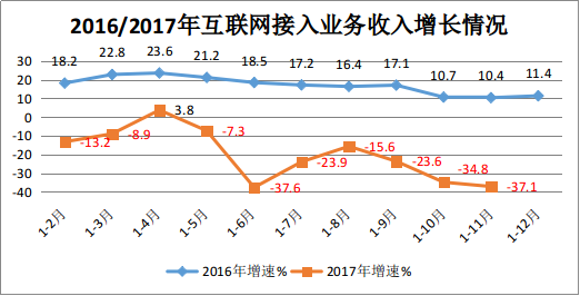 1-11月,互联网企业完成互联网接入业务收入162亿元,同比下降37.1%。