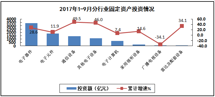 通信设备、电子器件行业投资增势突出。前三季度,电子器件行业投资同比增长28.6%。电子元件行业投资同比增长11.9%。整机行业中,通信设备和家用视听行业投资较快增长,投资分别为增速分别为49.5%和14.6%。电子计算机行业投资同比增长5.8%。