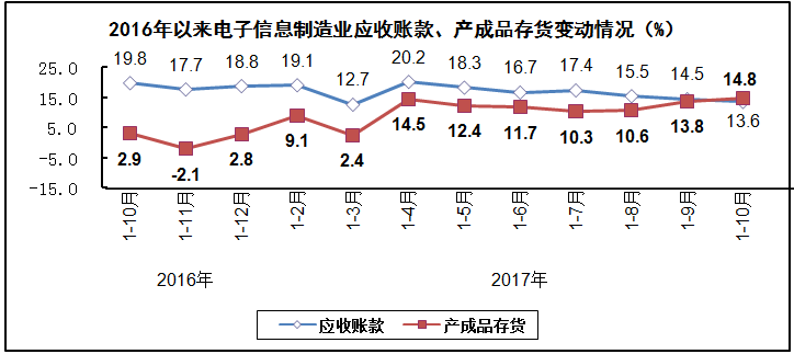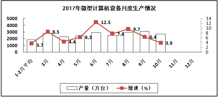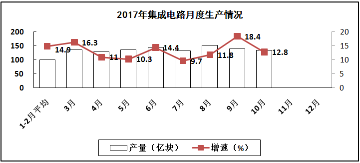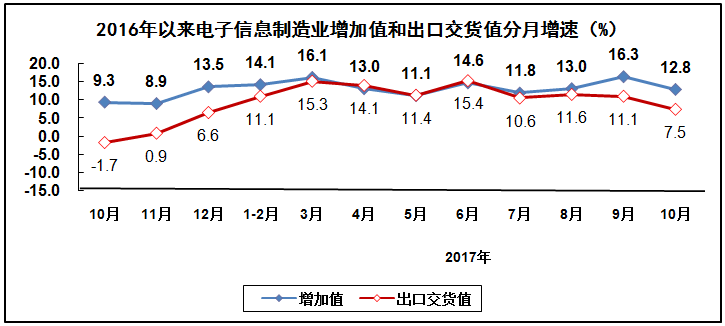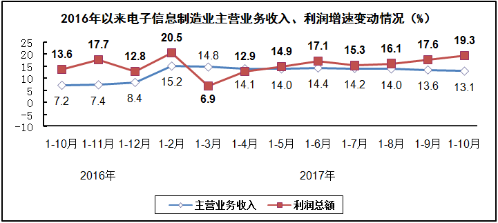 2017年1-10月,电子信息制造业延续稳中向好的发展态势,生产保持较快增长,出口形势明显好于去年同期,行业效益水平持续提升,固定资产投资保持高速增长。10月当月生产、出口增速比上月有所放缓。