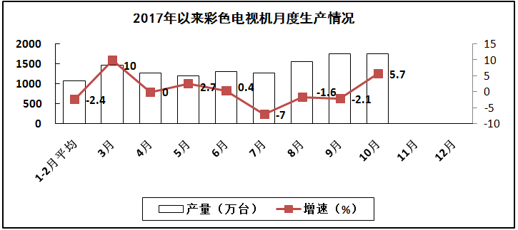 家用视听行业生产有所好转。1-10月,生产彩色电视机13781万台,同比下降1.3%,其中液晶电视机12945万台,同比下降4.0%;智能电视8592万台,同比增长3.6%,占彩电产量比重为62.3%。出口交货值同比增长13.4%,其中10月份增长8.5%。