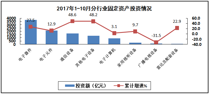 通信设备、电子器件行业投资增势突出。1-10月,电子器件行业完成投资同比增长27.5%,电子元件行业完成投资同比增长12.9%。整机行业中,通信设备和家用视听行业投资较快增长,完成投资增速分别为48.6%和9.7%。电子计算机行业完成投资同比增长3.1%。