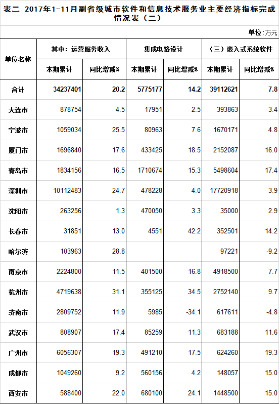 2017年1-11月副省级城市软件和信息技术服务业主要经济指标完成情况表(二)