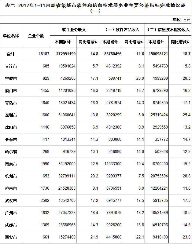 2017年1-11月副省级城市软件和信息技术服务业主要经济指标完成情况表(一)