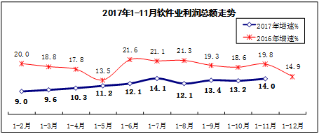 软件业务收入增长稳中有升。1-11月,我国软件和信息技术服务业完成软件业务收入49020亿元,同比增长14.5%,增速同比回落0.3个百分点,比1-10月提高0.6个百分点。其中11月份增长19.6%,增速比10月提高7个百分点。