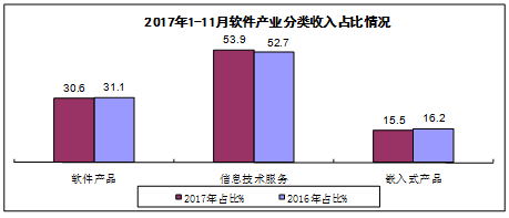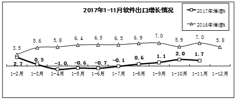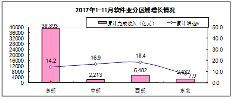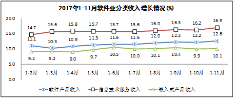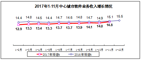 2017年1-11月,我国软件和信息技术服务业运行总体平稳,业务收入增长稳中有升,利润呈现良好发展态势。分领域看,工业软件发展加快,部分在线运营服务、电子商务平台技术服务持续较快发展。分地区看,主要软件大省保持稳步增长,中西部地区部分省市增势突出,中心城市软件业聚集领先发展。